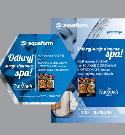 Koncepcja, projekt i przygotowanie do druku materiałów POS związanych z promocją w punkcie sprzedaży. Komplet materiałów obejmuje: projekt graficzny naklejki na kabiną, projekt graficzny plakatu A3, projekt naklejek na podłogą oraz projekt plakatu umieszczanego wewnątrz kabiny na brodziku. Całość materiałów konsekwentnie nawiązuje do stworzonej przez nas dla firmy Aguaform linii graficznej.