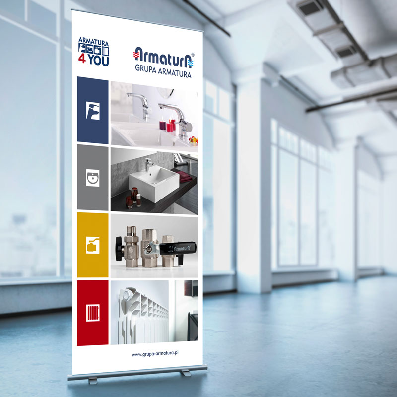 Projekt serii rollbanerów dla firmy Armatura przeznaczonych do identyfikacji w miejscach publicznych.