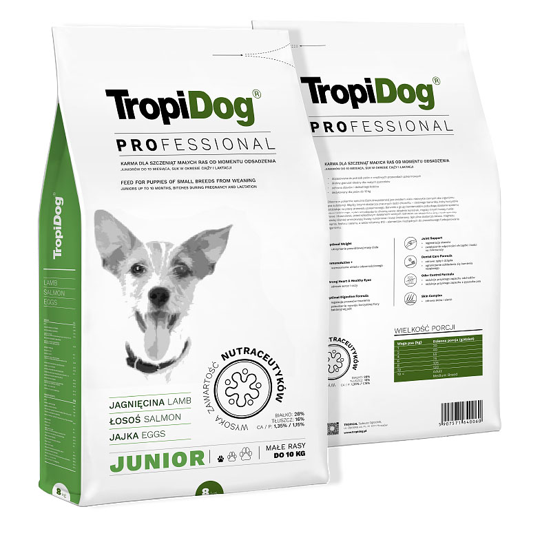 Opakowania profesjonalnej karmy dla psów TropiDog wraz z KV dla nowej linii produktów realizowane jako projekty koncepcyjne dla firmy Tropical. Pierwszy etap prac: to produkty bazowej linii Lifestage (junior, adult, senior z podziałem na wielkości psów: rasy małe, średnie, duże). Białe opakowania kojarzą się z profesjonalizmem, naukowym podejściem i laboratoryjną jakością. Zachowano elementy kolorystyczne nawiązujące do istniejących opakowań, uzupełnione o wizerunek psa wnoszący pozytywny element emocjonalny. Całość dopełniają ikony z najważniejszymi cechami karmy.